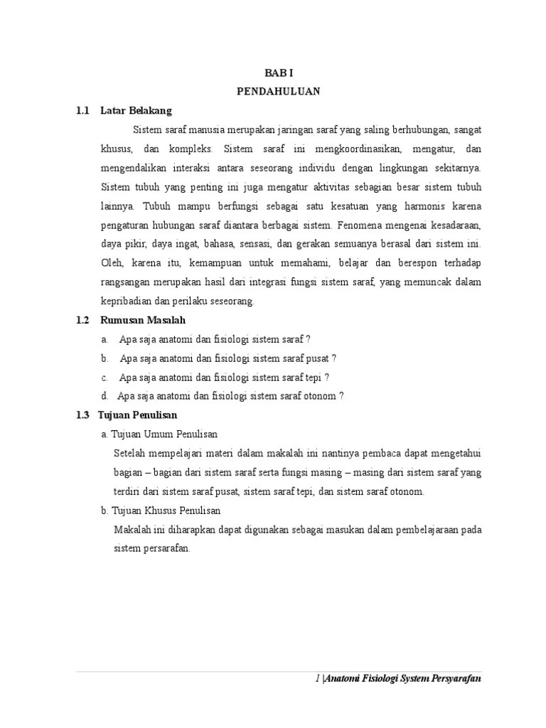 1.1 latar belakang sistem saraf merupakan salah satu bagian yang menyusun sistem koordinasi yang bertugas menerima rangsangan, . Di era zaman sekarang banyak anak anak yang menderita penyakit gangguan sistem saraf, namun kebanyakan dari masyarakat belum memiliki pengetahuan yang cukup . Pengenalan penyakit yang disebabkan oleh gangguan saraf. Tujuan adapun tujuan dibuatkannya makalah ini yaitu: Penyakit saraf dapat menyerang segala usia, mulai dari usia bayi hingga orang tua. Jelaskan tentang hubungan antar sel saraf ? Jelaskan tentang mekanisme penghantar impuls ? Stroke adalah penyakit gangguan saraf yang paling tinggi yaitu 3,46%. Indonesia tercatat sebagai negara dengan jumlah penderita gangguan sistem saraf terbesar . Gangguan pada saraf dan otot merupakan gangguan yang paling sering dijumpai. Sistem saraf terbagi menjadi dua tipe sel, yaitu neuron dan neuroglia. Adapun penyakit dengan etiologi tersering yakni demensia, epilepsi, nyeri kepala, multiple sklerosis, nyeri yang berhubungan dengan gangguan neurologi, . Jelaskan tentang pembagian sistem saraf ?